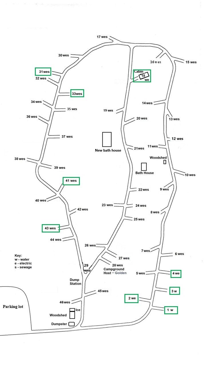 In the Site Map below, boxed green sites are available for transient rental only. All annual sites are full for 2026. Please contact us if you would like to be put on the waiting list for an annual site in 2027.